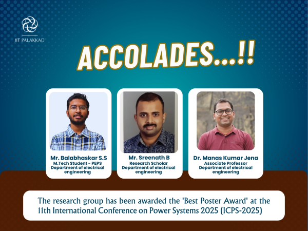 The research group including Mr. Balabhaskar S.S (M.Tech student - PEPS), Sreenath B (research scholar), and Dr. Manas Kumar Jena (Associate professor), Department of electrical engineering, has been awarded the 'Best Poster Award' at the 11th International Conference on Power Systems 2025 (ICPS-2025). The conference was jointly organized by IIT Hyderabad and SRLDC Grid-India, from December 7 to 9, 2025, at IIT Hyderabad.