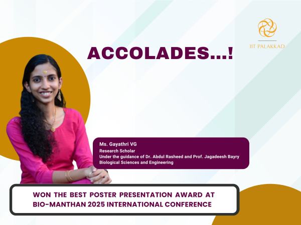 Ms. Gayathri VG, a research scholar under the guidance of Dr. Abdul Rasheed and Prof. Jagadeesh Bayry, in the department of biological sciences and engineering has received the best poster presentation award at BIO-MANTHAN 2025 International Conference, held at IIT Ropar from 4th - 7th December 2025.