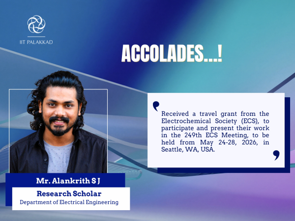 Mr. Alankrith S.J, Research Scholar, working with Dr. Revathy Padmanabhan in Department of Electrical Engineering, has received a travel grant from the Electrochemical Society (ECS), to participate and present their work in the 249th ECS Meeting, to be held from May 24-28, 2026, in Seattle, WA, USA.