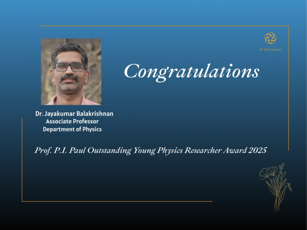 Dr. Jayakumar Balakrishnan, Associate Professor, Department of Physics, has been awarded the Prof. P. I. Paul Outstanding Young Physics Researcher Award 2025, instituted by the Prof. P. I. Paul Study and Research Centre, Department of Physics, Christ College, Irinjalakuda. He received the award from Prof. Sabu Thomas, former Vice-Chancellor of MG University, Kottayam.