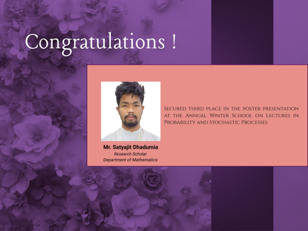 Mr. Satyajit Dhadumia, Research Scholar under the guidance of Dr. Ashok Kumar M, Associate Professor, Department of Mathematics, secured third place in the poster presentation titled 'A Generalized Cramer-Rao Bound in the context of Robust Estimation', at the Annual Winter School on Lectures in Probability and Stochastic Processes, held at IIT Madras from 08–12 December 2025.