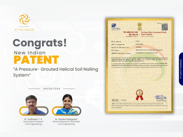 Indian Institute of Technology, Palakkad, has been granted a new Indian patent for the invention titled, ‘A Pressure-Grouted Helical Soil Nailing System.’ The invention is credited to Dr. Sudheesh T.K, associate professor, and Dr. Gopika Rajagopal, senior research associate, department of civil engineering.