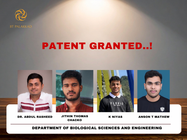 A patent has been granted for the research group of Dr. Abdul Rasheed, Jithin Thomas Chacko, K Niyas, and Anson T Mathew, department of biological sciences and engineering for their work on Wearable Patch Using Carbon Cloth Thread Electrode for Non-Invasive Glucose Monitoring and Method of Preparation. (Indian Patent No: 575803 granted on 15 Dec 2025).